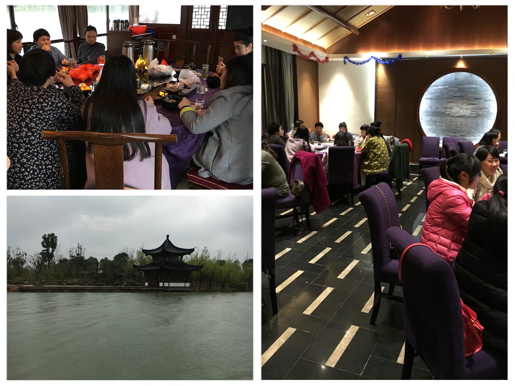 2、特殊天气下的特殊主场:虽天气预报已提前告知了下雨的可能性,但当天雨水力度之大和持续时间之久却是超乎意料,不过这丝毫没有影响到众女神的兴致。就在湘湖大院的私家码头边,大家按计划先登上已恭候多时的高大上的游舫,开始了雨中环湖之旅,由于天气实在糟糕,偌大的湘湖也被我们承包了,看不到第二艘船只。舫外骤雨敲窗,周边的山峦、层林、庙宇被水墨画式的天青色笼罩,澄碧的湖面荡起无数涟漪,自有一种不同寻常的江南春韵;舫内热情如火,窗外冽风冷雨被自动屏蔽,女神们有的自组战队切磋牌艺,有的聊天吃喝两不误,燃爆的气氛,与孤舫湖中游的外围环境形成强烈反差。 如此雅兴,如此情致,夫复何求!